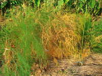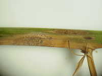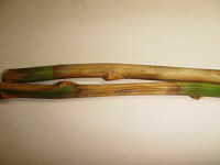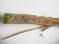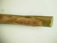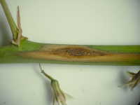 被害:茎に紡錘形の病斑を生じ、進展すると上部が枯れる。