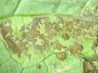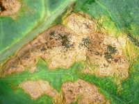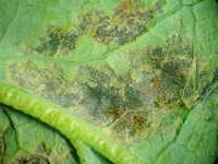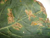 | 発生時期:10月〜2月 病原:糸状菌(かび) 伝染方法:病原菌は発病葉について越冬する。 被害:葉に葉脈で区切られた多角形の黄褐色病斑を生じる。花蕾腐敗症状を生じる。 |
