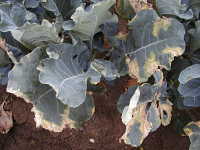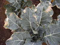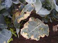| 発生時期:5月、9月〜10月 病原:細菌 伝染方法:土壌中に残った発病茎葉内で病原細菌が生存して伝染源となる。次期作では、土はねに伴い飛散して伝染する。また、種子伝染もする。 被害:葉の縁にV字形や不正形で黄色の大型病斑を生じる。 |