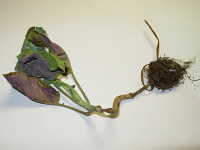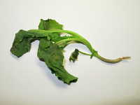 | 発生時期:育苗期〜定植期 病原:糸状菌(かび) 伝染方法:ほ場に残った発病葉上の病原菌や、地表面に菌核として残った病原菌が、伝染源となる。 被害:苗の地際部がくびれて細くなり、萎れる。 |
