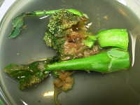 | 発生時期:11月〜3月 病原:細菌 伝染方法:病原細菌が土壌中の有機物中で長期間生存し、伝染源となる。降雨の時に土はねにより伝染する。 被害:花蕾部が水浸状となり、腐って悪臭を発する。 |