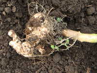 被害:定植1カ月後頃から根にこぶができ始め、2カ月後頃になるとこぶが拡大し、葉がしおれ、生育不良になる。