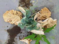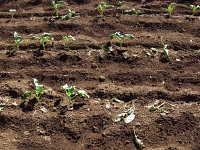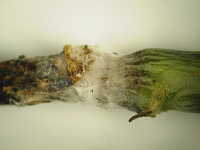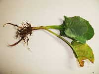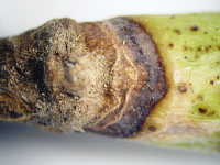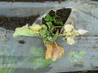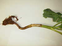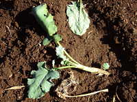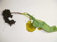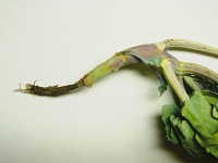 | 発生時期:4月、9月〜10月 病原:糸状菌(かび) 伝染方法:病原菌が発病茎葉とともに土壌中で越冬し、伝染源となる。次期作では、そこから胞子を飛散し伝染する。 被害:地際部の茎に小黒点を生じ、茎が細くくびれて枯死する。 |