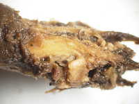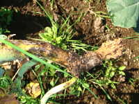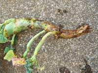 被害:地際部の茎に小黒点を生じ、茎が細くくびれて枯死する。