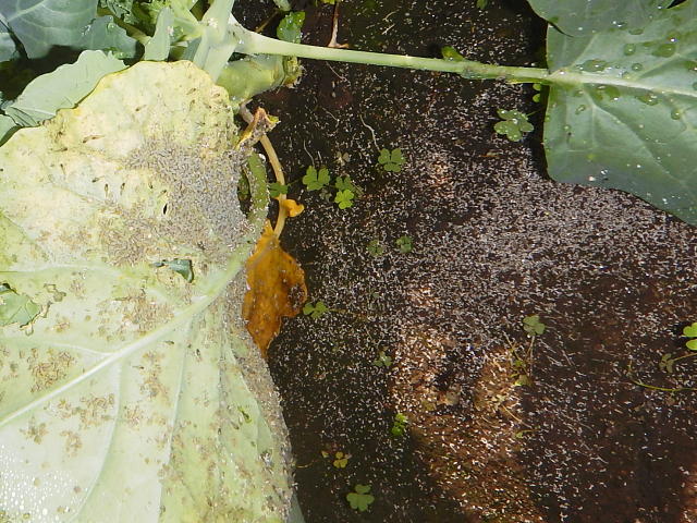 葉裏のニセダイコンアブラムシと脱皮殻