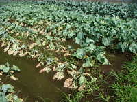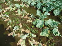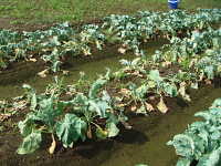 ブリッコリーが湿害を受けると、下葉が褐変し、症状が進むと枯死する。