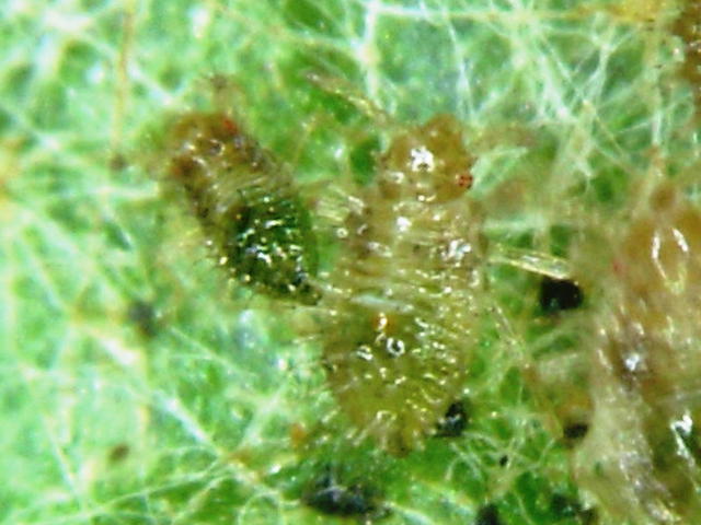 アワダチソウグンバイ1齢幼虫(体長0.4mm)及び2齢幼虫(体長0.6mm)