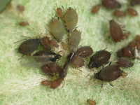 被害:成虫及び幼虫による吸汁害。寄生された葉は萎縮する。