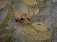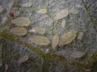 | 発生時期:7月〜8月 被害:成虫及び幼虫による吸汁害 参考:クギケアブラムシは、背中に釘状の長い毛がある。 |