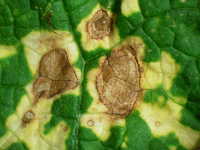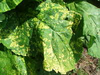 | 発生時期:5月〜6月、9月 病原:ウイルス(ゴボウモザイクウイルスほか) 伝染方法:アブラムシ類がウイルスを媒介する。 被害:葉に鮮やかな黄色のモザイク症状を生じる。収量及び品質への影響は少ない。 |