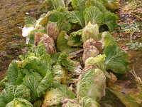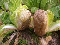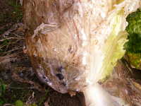 | 発生時期:11月〜12月 病原:糸状菌(かび) 伝染方法:地表面に落ちた菌核が伝染源となる。次期作では、そこから胞子が飛散して伝染する。 被害:葉に白色綿状のかびを生じ、後にネズミ糞状の菌核を生じる。 |