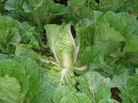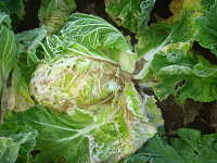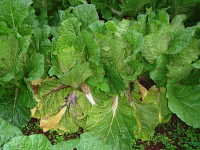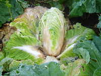 伝染方法:土壌中に残った発病根上で病原細菌が長期間生存して伝染源となる。次期作では、土はねに伴い飛散して伝染する。周辺には多雨・多灌水により水媒伝染する。 被害:葉柄の地際部が水浸状淡褐色になり、軟化腐敗し、次第に内部の葉に進展する。特有の悪臭を放つ。