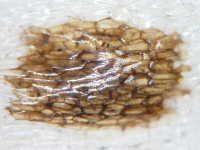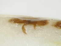 被害:中肋部に長径5〜10mmの楕円形褐変を生じる。また、長径0.5〜2mmの小褐変を生じる。褐変は内側の葉の中肋部にも見られる。