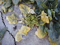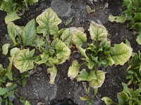 | 発生時期:3月〜6月、10月〜11月 病原:ウイルス 伝染方法:アブラムシ類がウイルスを媒介する。 被害:外葉数枚は異常が少ないが、新葉には濃淡のモザイク症状を生じ、株全体が萎縮する。 |