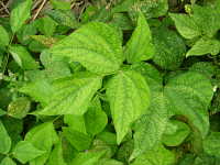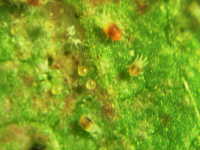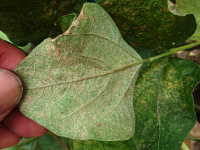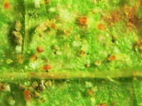 被害:成虫及び幼虫の加害により葉にかすり状の白点ができる。