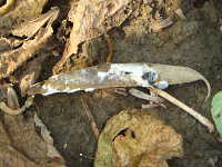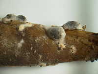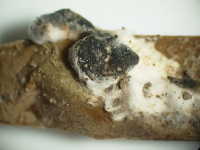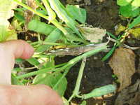 | 発生時期:6月 病原:糸状菌(かび) 伝染方法:地表面に落ちた菌核が伝染源となる。次期作では、そこから胞子が飛散して伝染する。 被害:莢、葉柄等に白色綿状のかびを生じ、後にネズミ糞状の菌核を生じる。 |