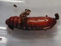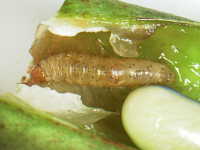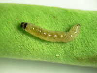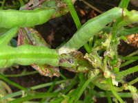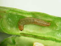 | 発生時期:10月 被害:幼虫が食害しながら葉を綴る。また、いくつかの莢を綴りながら莢や内部の子実を食害する。 |