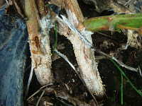 被害:地際部に白色絹状の菌糸を生じ、後に茶褐色のアワ粒大の菌核を形成する。