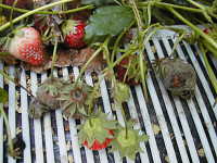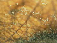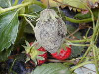 | 発生時期:11月〜5月 病原:糸状菌(かび) 伝染方法:ほ場に残った発病葉・発病果上の病原菌や、地表面に菌核として残った病原菌が、伝染源となる。次期作では、そこから胞子が飛散して伝染する。 被害:果実に灰色かびを密生した病斑を生じる。葉柄や葉にも灰色かびを生じる。 |