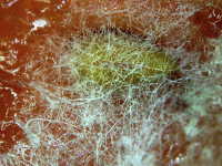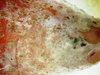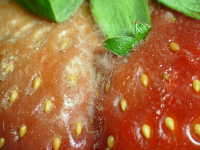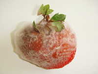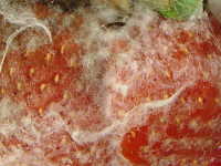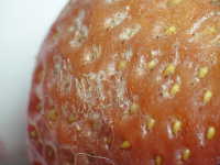 | 発生時期:11月〜5月 病原:糸状菌(かび) 伝染方法:ほ場に残った発病葉・発病果上の病原菌や、地表面に菌核として残った病原菌が、伝染源となる。次期作では、そこから胞子が飛散して伝染する。 被害:果実に灰色かびを密生した病斑を生じる。葉柄や葉にも灰色かびを生じる。 参考:灰色かび病感染果は、出荷後の湿度が高い条件では、白い菌糸を発生する。 |