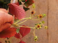 被害:葉が赤紫色に変色。花托部が黒褐変して果実が肥大しない。
