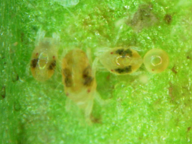 カンザワハダニ第1若虫(体長0.25mm)、第2若虫(体長0.35mm)