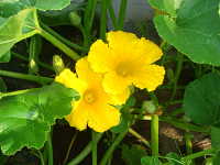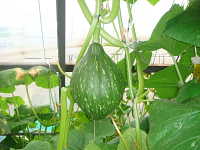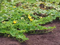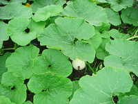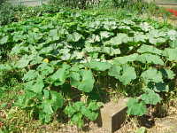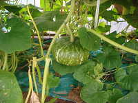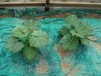 カボチャは5月に定植し、7月中旬〜8月に収穫する。