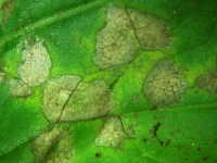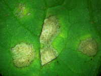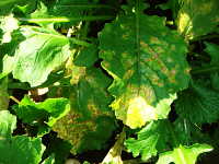 | 生時期:10月〜11月 病原:糸状菌(かび) 伝染方法:病原菌は、発病株の根部や発病葉に付いて越冬し、翌年春にそこから胞子を飛散して伝染する。なお、病原菌は生きたアブラナ科植物にしか寄生できない。 被害:葉脈に区切られた多角形病斑を生じる。 |