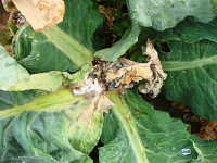 被害:茎に白色綿状のかびを生じ、後にネズミ糞状の菌核を生じる。
