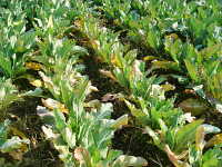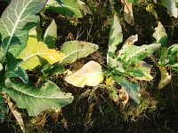 カリフラワーが湿害を受けると、下葉が黄化し、症状が進むと枯死する。