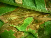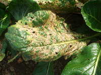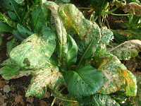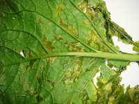 | 発生時期:10月 病原:糸状菌 伝染方法:病原菌は、発病株の根部や発病葉に付いて越冬し、翌年春にそこから胞子を飛散して伝染する。なお、病原菌は生きたアブラナ科植物にしか寄生できない。 被害:不正形の葉脈に区切られた褐色病斑を生じる。 |
