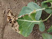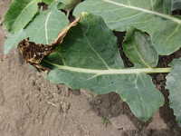 被害:葉の縁に黒褐色の病斑を生じる。。