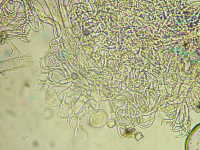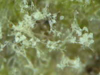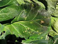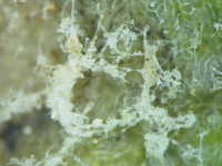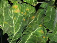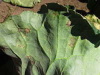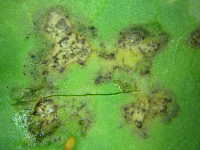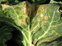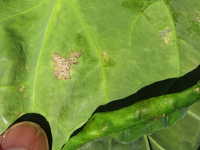 | 発生時期:4月〜5月 病原:糸状菌(かび) 伝染方法:ほ場に落ちた発病葉上で生き残った病原菌が、伝染源となる。次期作では、そこから胞子が飛散して伝染する。 被害:葉に葉脈で区切られた灰褐色の病斑を生じ、葉裏には白色の菌そうが形成される。 |