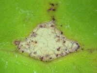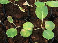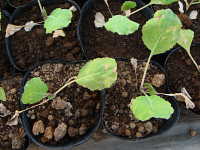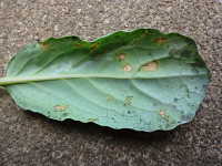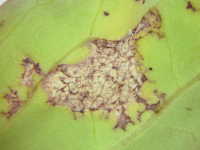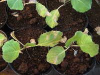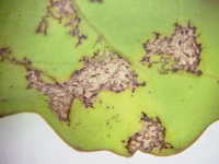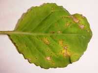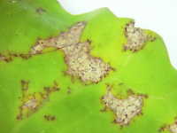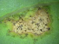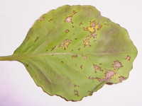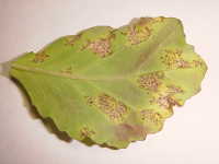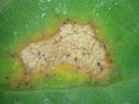 | 発生時期:2月〜4月(ハウス内) 病原:糸状菌(かび) 伝染方法:ほ場に落ちた発病葉上で生き残った病原菌が、伝染源となる。次期作では、そこから胞子が飛散して伝染する。 被害:葉に葉脈で区切られた灰褐色の病斑を生じ、葉裏には白色の菌そうが形成される。 |