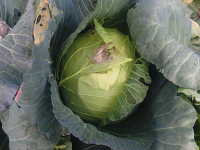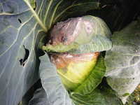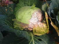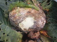 | 発生時期:3月〜5月、10月〜11月 病原:糸状菌(かび) 伝染方法:地表面に落ちた菌核が伝染源となる。次期作では、そこから胞子が飛散して伝染する。 被害:結球部に白色綿状のかびを生じ、後にネズミ糞状の菌核を生じる。 |