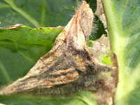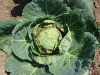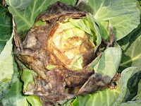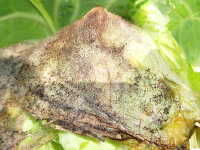 | 発生時期:7月〜8月(高温期) 病原:糸状菌(かび) 伝染方法:胞子が風で飛ばされ、伝染源となる。 被害:コウガイケカビはしおれた花、傷んだ果実に生える腐生性の菌であるが、条件が合うと健全な植物にも寄生し、キャベツでは葉縁から褐変し、白いケカビを密生する。 参考: |
