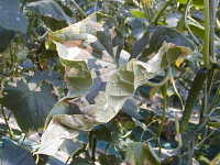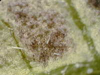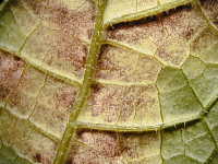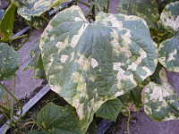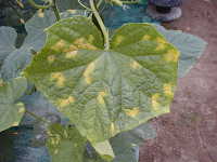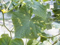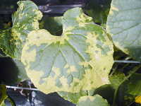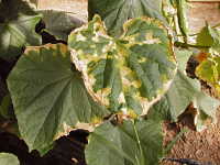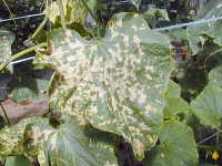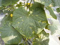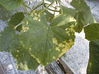 | 発生時期:ハウスでは周年発生、露地では6月〜7月 病原:糸状菌(かび) 伝染方法:病原菌は発病葉について越冬する。キュウリが周年栽培されている地域では、常時胞子が飛散しているため発生しやすい。 被害:葉に葉脈で区切られた多角形の黄色病斑を生じる。 |