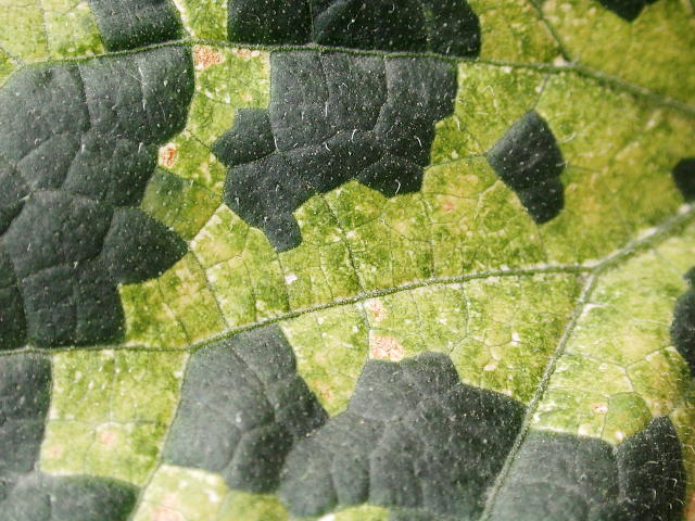 べと病 葉表は葉脈で区切られた黄緑色病斑となる