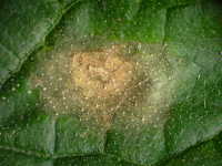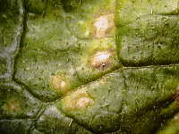 | 発生時期:生育中期〜後期 病原:糸状菌(かび) 伝染方法:発病茎葉や農業資材などに付着した病原菌が、長期に生存して伝染源となる。 被害:葉に黄褐色の円形小斑点を生じ、後に同心円紋の大型病斑を生じる。 |