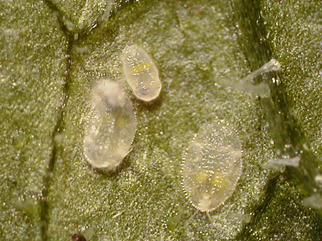 オンシツコナジラミ3齢幼虫(0.5mm)及び4齢幼虫(0.8mm)
