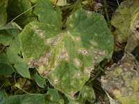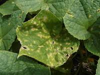 | 発生時期:6月〜9月(露地栽培で主に発生する) 病原:糸状菌(かび) 伝染方法:病原菌は発病茎葉や支柱に付着して越冬し、翌年の伝染源となる。 被害:葉に淡褐色の円形病斑を生じる。葉の病斑は内部がへこみ、穴が空きやすい。果実にも褐色の窪んだ病斑を生じる。 |