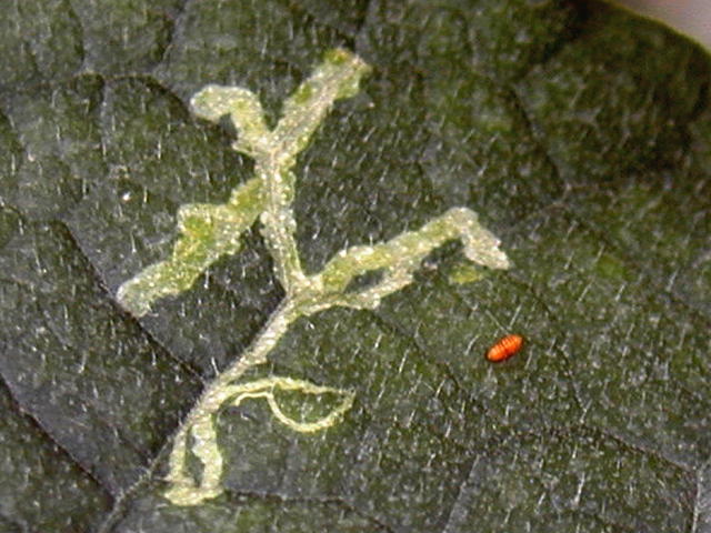 トマトハモグリバエ 被害葉と葉上の蛹(通常は地表面で蛹化する)