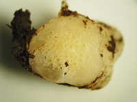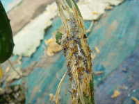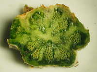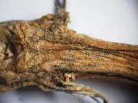 被害:茎に発生し、病徴が進展すると株はしおれて枯死する。葉や果実でも発病し、黒粒点を生じる。