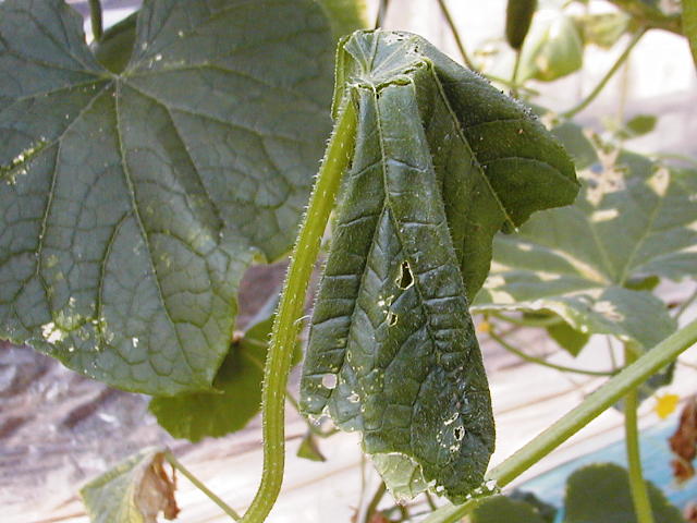 ウリキンウワバ幼虫によるキュウリ被害葉