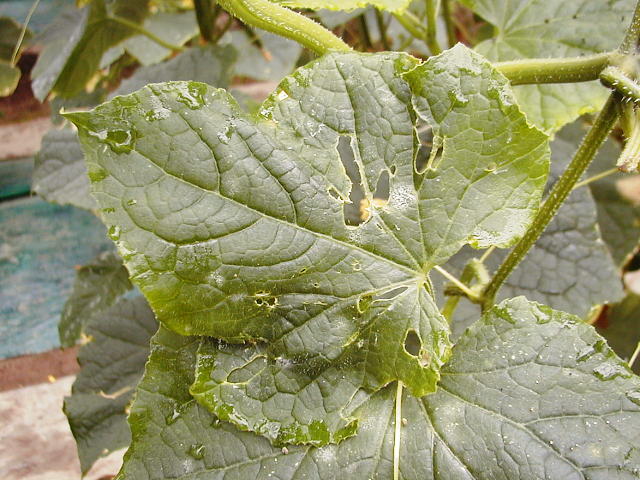 ワタヘリクロノメイガ幼虫によるキュウリ被害葉(葉表)