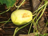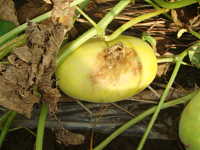 被害:葉、茎、果実に褐色の病斑を作る。湿度が高い時は、病斑上に鮭肉色の胞子を形成する。