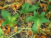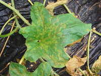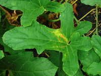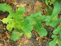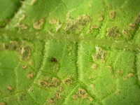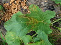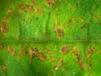 被害:葉に褐色のやや角形病斑を生じ、病斑周辺に淡黄色のかさを伴う。