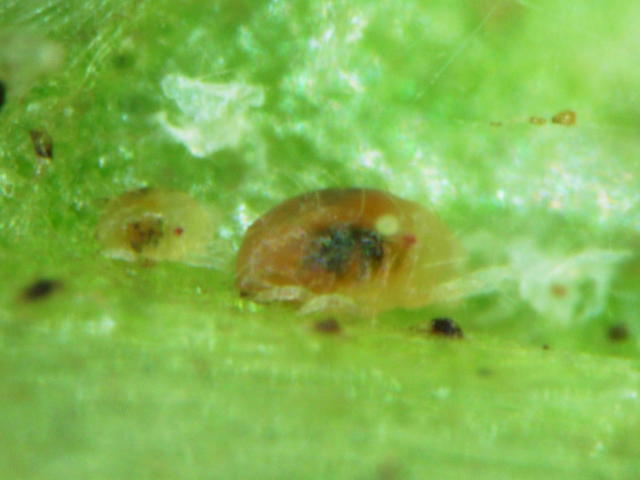 カンザワハダニ幼虫(体長0.2mm)、第2若虫(体長0.35mm)