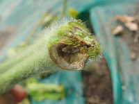 被害:茎の導管部が褐変し、地上部が数日でしおれ、回復しない。(青枯れ症状)