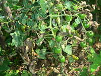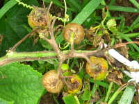 | 発生時期:9月〜6月 病原菌:糸状菌(かび) 伝染方法:病原菌は発病茎葉上で越冬し、伝染源となる。また、ジャガイモの発病茎葉から飛散した胞子によっても伝染する。 被害:葉、果実、茎に褐色のやや窪んだ病斑を生じる。 |